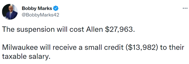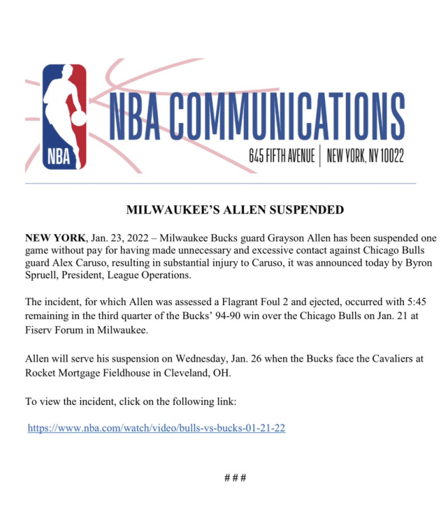 JRS直播01月24日讯 卡鲁索右手腕骨折,需要休战至少6-8周,这也让对他恶意犯规的格雷森-阿伦成为口诛笔伐的对象。NBA官宣禁赛阿伦一场,将在雄鹿对骑士的比赛中生效。阿伦损失27963美元薪水,雄鹿节省13982美元奢侈税。这位雄鹿后卫也在自己的Discord社媒上正式回应了弄伤卡鲁索一事,他坚持表示自己绝非故意这么做,另外也解释了自己在场边露出笑容的原因。
