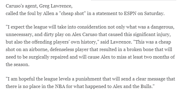 卡鲁索的经纪人Greg Lawrence发表声明,他表示:我希望联盟介入调查,能够考虑到,那不仅是个对卡鲁索危险的、完全没必要且肮脏的动作,造成了卡鲁索的重伤,而且也得考虑到恶犯球员他自己的历史;这是一个对仍在空中球员的下作的、没有任何保护的动作,它最终导致了卡鲁索的骨折,需要手术修复伤势,Alex至少会缺席两个月的时间。