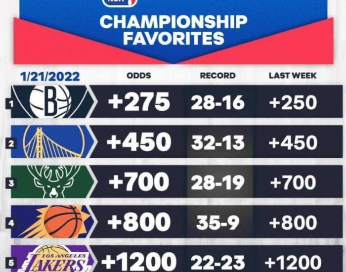 JRS直播01月22日讯 北京时间1月22日,NBA官方公布了最新的夺冠赔率,结果令人非常意外。篮网高居第一,勇士、雄鹿和太阳分列2-4位。湖人竟然排名第5,赔率是+1200!