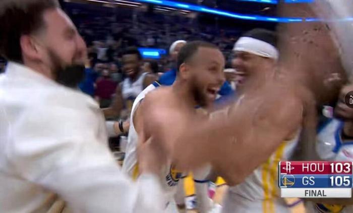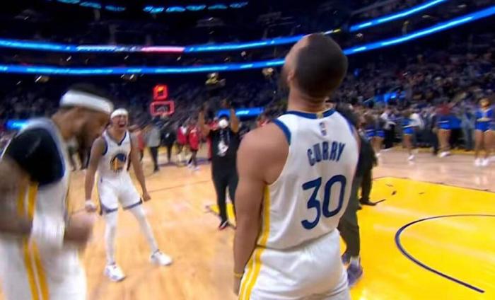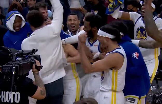 而在完成绝杀之后,库里也非常兴奋。他摘下牙套,单手指天,直接飞奔回本方半场,看起来想回更衣室。不过,勇士队友和工作人员拦住了库里,大家围成一个圈进行庆祝。所有人都在蹦蹦跳跳,非常开心。库里也疯狂跳舞,随后原地仰天怒吼,高兴极了!