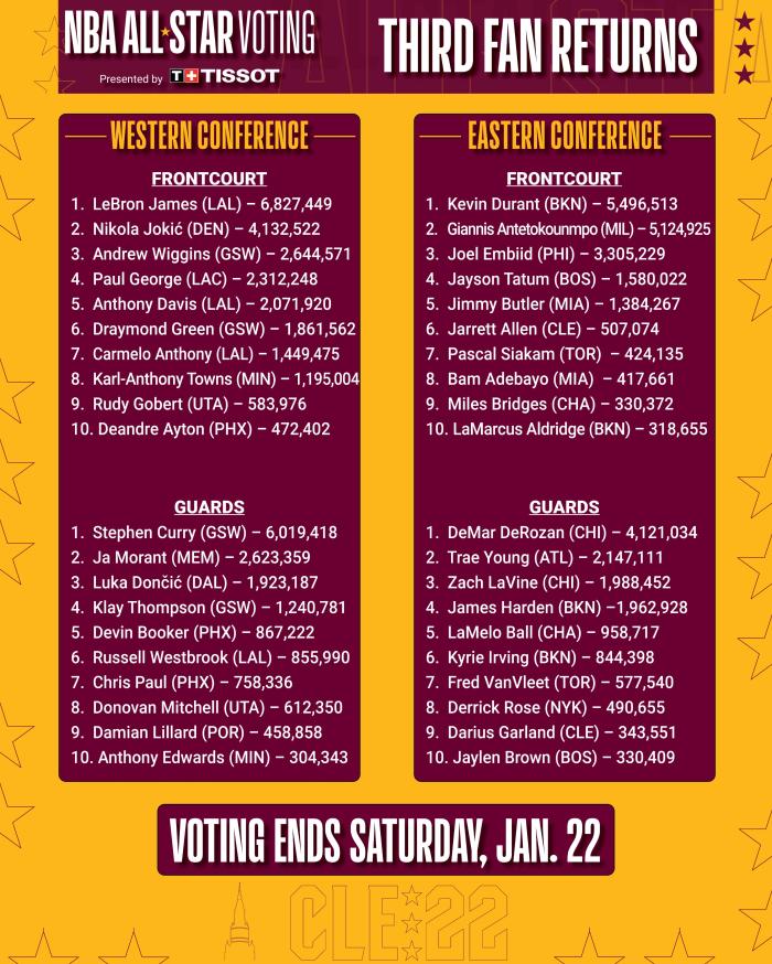 今年NBA全明星赛将于1月19-21日在克利夫兰举办,全明星首发阵容将在1月28日公布,目前詹姆斯6827449票已经反超库里成为新的票王,而且领先库里80多万票,西部队长和全明星票王应该没悬念了。