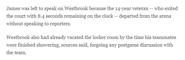 由于在最后4分钟遭弃用,威少十分不满,当比赛还剩8.4秒时,威少提前离场;当队友都在洗澡时,威少早早离开更衣室,不再与球队进行赛后讨论,赛后威少拒绝接受采访并且早早离开球馆。