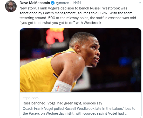 Dave McMenamin表示,在湖人主帅弗兰克-沃格尔此次让威少关键时刻坐板凳的决定很长一段时间之前,他就已经得到了湖人管理层的批准,支持他在执教威少时采取强硬手段,也就是可以在关键时刻雪藏威少。