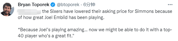 JRS直播01月21日讯 ,费城76人已经开始降价交易西蒙斯,据美媒B/R记者Bryan Toprek报道,由于恩比德的出色表现,76人已经降低了对西蒙斯的要价,索要排在联盟前40名的球星。