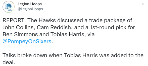 不久前,76人记者KeithPompey透露此前费城与老鹰的2换3交易谈崩,双方谈判的筹码是老鹰送走科林斯、雷迪什和一个首轮选秀权,76人想同时交易走西蒙斯和哈里斯,最终这次谈判因76人加入哈里斯而谈崩;目前老鹰已经把雷迪什交易到尼克斯。