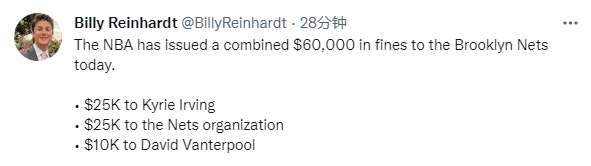 第三、篮网被范德普尔连累从而被罚款25000美元。