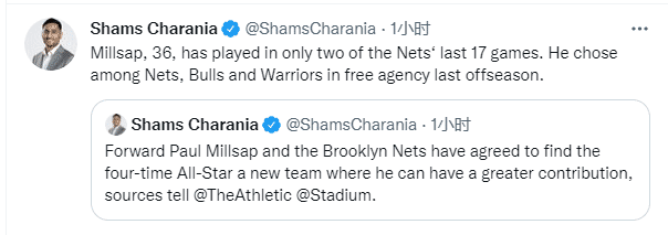 JRS直播01月21日讯 ,篮网队一夜吃到三张罚单并且被联盟罚款6万美元,并且已经决定放弃米尔萨普;虽然篮网还没官宣,但36岁老将已经清空社交媒体并且在推特上发文写道:动力,谢谢!