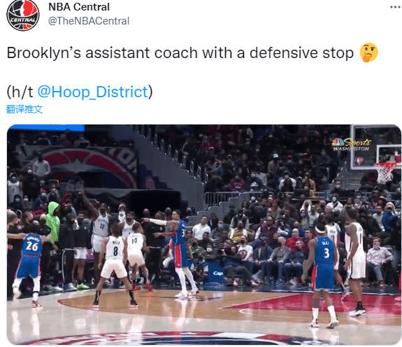 第四节2分09秒,奇才在边线的一次传球被场外的篮网助教范德普尔破坏了一下,当时,丁威迪传球给库兹马,范德普尔伸手碰了一下球,改变了球的飞行轨迹,球最后蹭到库兹马的手出界;裁判吹罚奇才出界违例,篮网获得球权!
