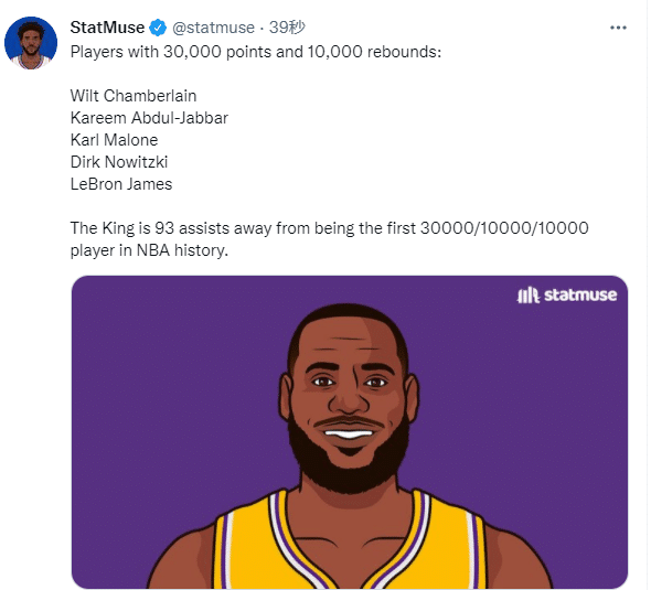 随着本场拿到10个篮板,詹姆斯常规赛篮板数正式突破10000次大关,成为历史第42位10000+篮板先生。