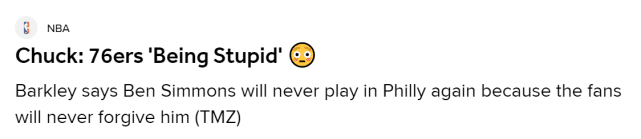 JRS直播01月19日讯 ,名宿查尔斯-巴克利在接受TMZ体育采访时,怒斥76人管理层太愚蠢,并直言费城球迷永远不会原谅西蒙斯。他建议76人赶快给火箭等多支球队打电话,送走西蒙斯。
