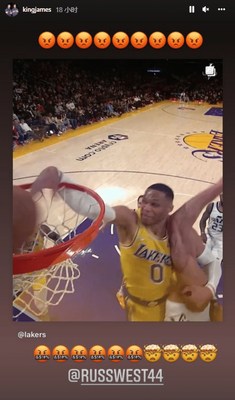 赛后,詹姆斯在社交媒体上转发威少隔扣戈贝尔的画面,配上9个愤怒的表情,还有多个怒骂的表情,如此表情便是詹姆斯真实心情的写照。