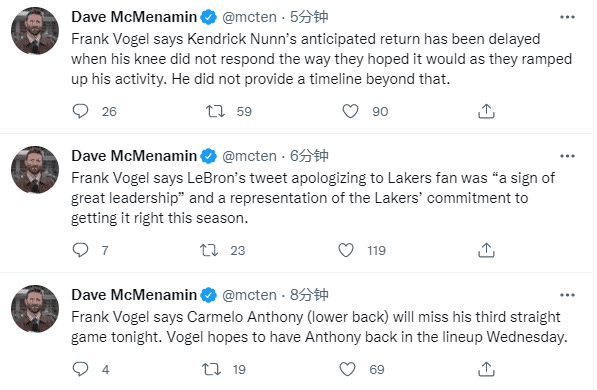 JRS直播01月18日讯 ,湖人和爵士大战赛前,沃格尔透露安东尼因背部痉挛继续缺席比赛,连续三场因伤休战,预计周四对阵步行者复出,沃帅还透露纳恩复出推迟,浓眉将在今天复查伤势,还谈到詹姆斯公开道歉这件事。