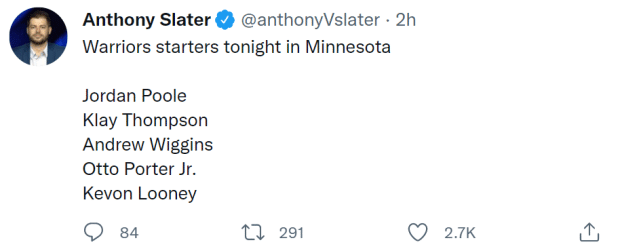 JRS直播01月17日讯 ,勇士客场对阵森林狼。科尔早早公布了本场比赛的首发阵容:普尔、汤普森、维金斯、波特和卢尼。这将是勇士本赛季使用的第15套首发阵容。库里因右手酸痛缺席本场比赛,格林和佩顿也因伤缺阵。上一场比赛,勇士138-96大胜公牛。
