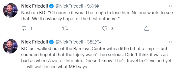 据名记Nick Friedell报道,杜兰特离开球馆时一瘸一拐,但听起来伤势并不太严重,应该没有当年被帕楚里亚撞伤那样糟糕,目前还不知道他是否会随队前往克利夫兰。