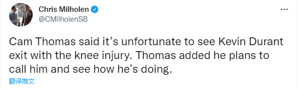 篮网新秀卡梅隆-托马斯表示:这太不幸了,你知道的,杜兰特是我的兄弟,我不希望看见我的兄弟倒下,我会给他打个电话的。