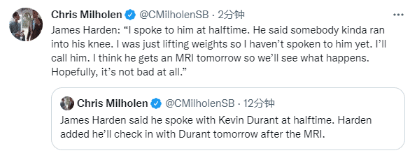 赛后哈登表示在中场休息时,他和杜兰特谈过话了,杜兰特说有人撞到了他的膝盖,看到他因伤退赛太难了;哈登还说他将会给杜兰特打电话,希望他的伤势无碍;另外哈登还表示,明天他将会和杜兰特一起接受检查。