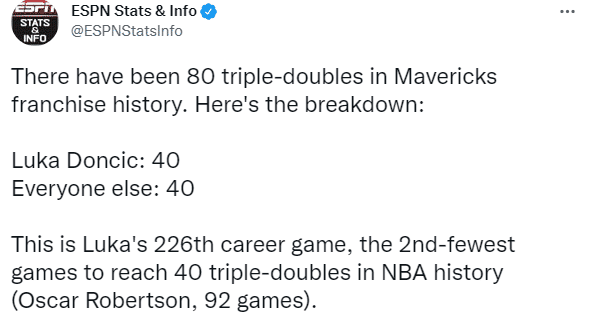 独行侠队史总共有80次三双,东契奇独占一半,仅用262场拿到40次三双,仅次于大O罗伯特森(92场达成40次三双)创造历史第二快纪录。