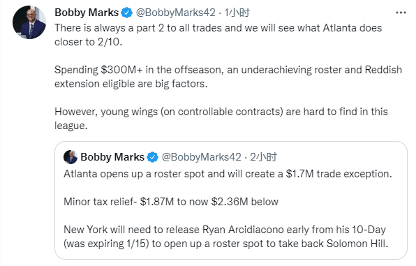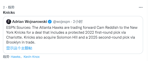 JRS直播01月14日讯 NBA又有一笔大交易达成,老鹰和尼克斯达成一笔3换2大交易,如此交易引热议,冲上推特热搜榜第二名。