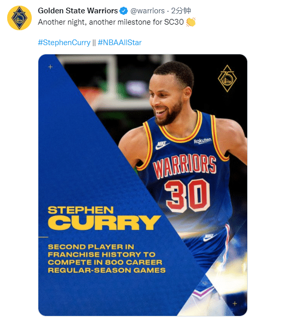 除了得分破千,今天也是库里为勇士出战的第800场比赛,成为勇士队史第二位常规赛出场数达到800场的球员,勇士队史出场最多的球员是克里斯-穆林(807场);勇士官方第一时间恭喜库里:另一个夜晚,库里的另一个里程碑。