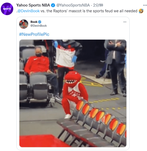 JRS直播01月13日讯 ,太阳球星德文-布克更换社交媒体头像引热议,布克把推特头像换成猛龙吉祥物被撵到场边的画面,配文写道:个人资料新头像;美媒Yahoo Sports NBA发推写道:布克和猛龙吉祥物是我们需要的体育世仇。