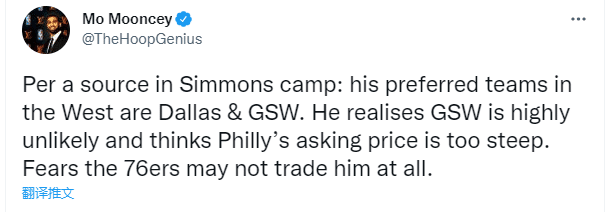 JRS直播01月13日讯 ,曝西蒙斯有意加盟独行侠,据Mo Mooncey报道,西蒙斯阵营认为,他(西蒙斯)最喜欢的西部球队是独行侠和勇士。他认为费城的要价太高,几乎不可能加盟勇士,他甚至担心76人可能根本不会交易他。
