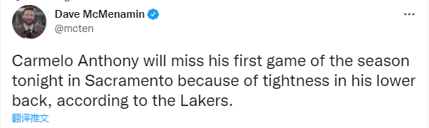 37岁高龄连续出战41场比赛,可如今瓜哥因腰部伤势而缺战国王,本来被列出出战成疑,之后升级为赛前决定,最终安东尼因伤休战;本赛季首次缺席,也是湖人生涯首次缺战。