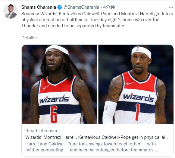 JRS直播01月12日讯 ,据名记shams报道,奇才队发生内讧,奇才与雷霆比赛中场休息时,波普和哈雷尔发生肢体冲突,两人挥拳相向,所幸被队友拉开,两人并没有打到对方,名记还报道这次冲突的起因。