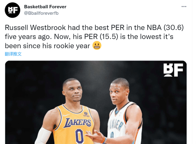 据统治,威少本赛季目前为止的效率值PER只有15.5,这是他自新秀赛季以来的最低。而2016-17赛季,也就是神龟当选MVP那年,他的效率值高达30.6排在全联盟第一。威少投射能力一直不佳,如今随着年龄的增长,他的爆发力和速度也出现了肉眼可见的下滑。过去两场比赛,威少得分都是个位数。