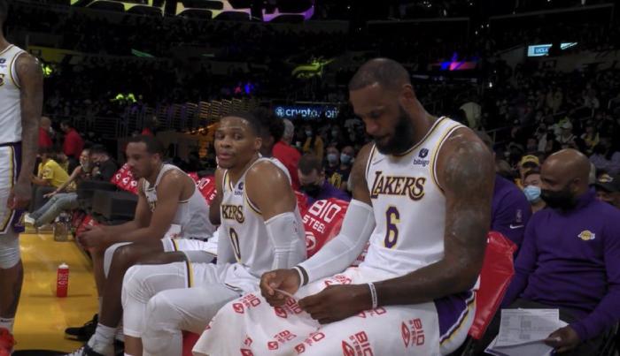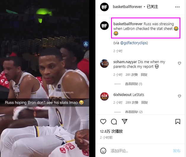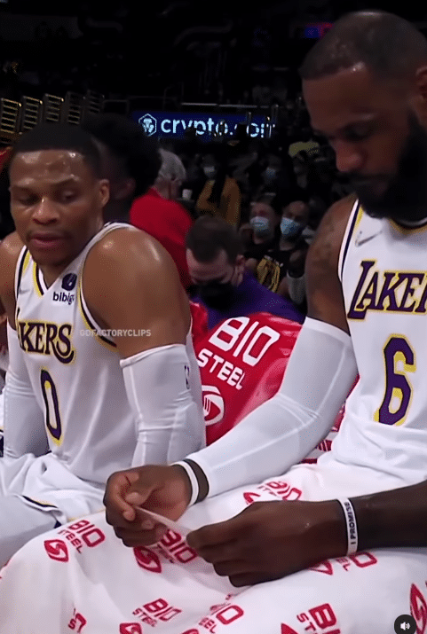 JRS直播01月11日讯 ,美媒BasketballForever晒出湖人替补席罕见一幕,并且配文写道:当勒布朗检查统计表时,威少很紧张;视频中配文写道:威少希望詹姆斯不要看到他的数据。