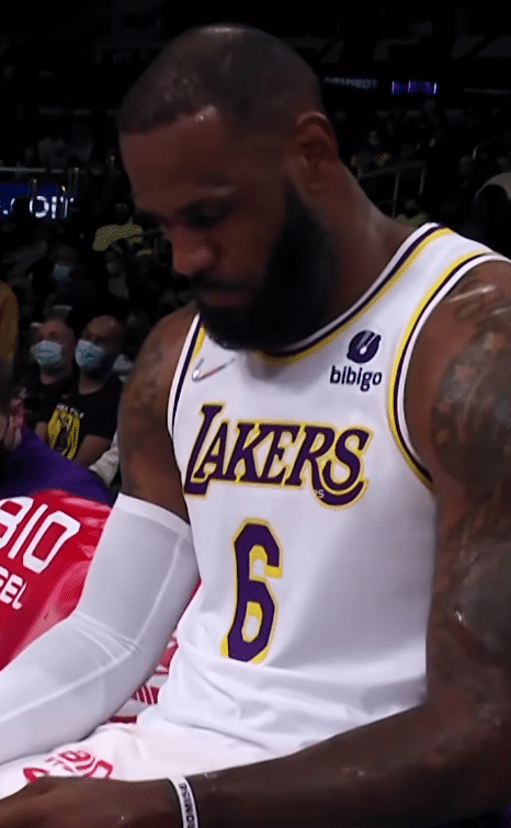 从视频中可以看出,湖人众将坐在场边,詹姆斯认真查看球队的数据统计表,表情严肃甚至有些怒气。
