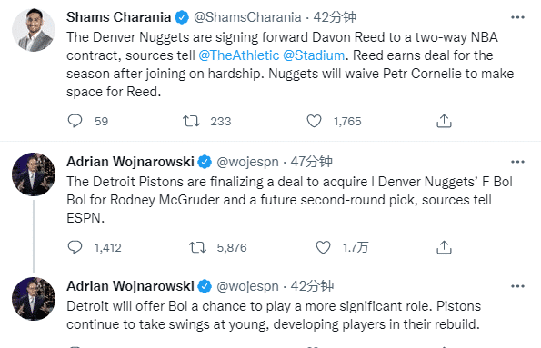 JRS直播01月10日讯 ,NBA又有一笔交易达成,据ESPN名记沃纳罗斯基报道,掘金与活塞达成交易,掘金送出前锋波尔-波尔,从活塞得到了麦格鲁德和一枚未来的二轮签;活塞获得的选秀签是一枚来自篮网的2022年的次轮签,活塞将为波尔提供更多的上场机会。