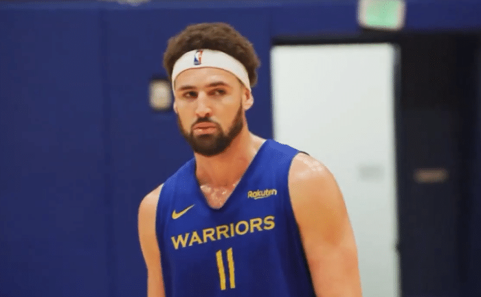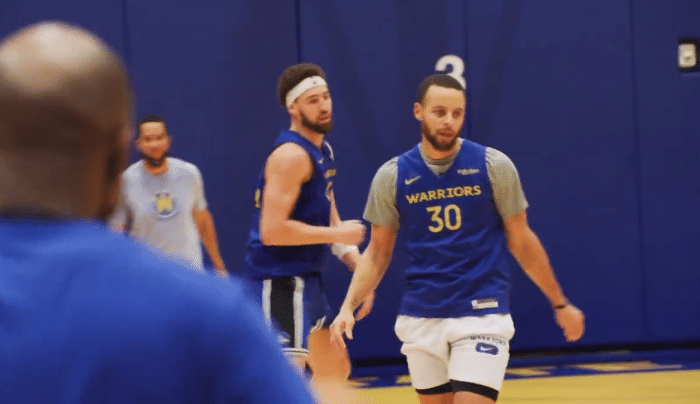 在勇士队内训练中,库里和汤普森被分在一队,在一次进攻中,库里持球组织进攻,汤普森跑位,之后库里助攻汤普森轰进三分,克莱接球就投,水花兄弟连线这一幕太令人怀念,不禁令人直呼爷青回。