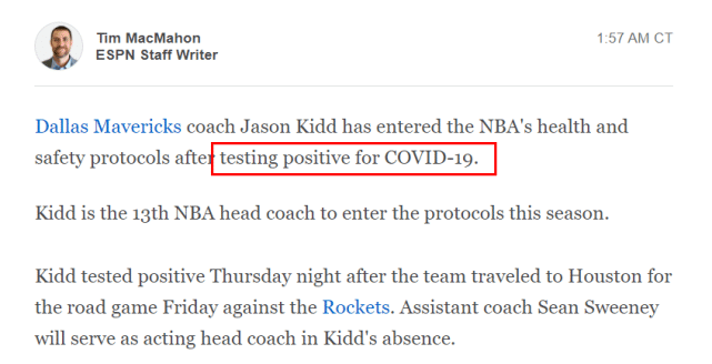 JRS直播01月08日讯 ,据ESPN报道,达拉斯独行侠主帅杰森-基德的新冠检测结果阳性,成为NBA本赛季第13位触发健康安全协议的主教练。此前,卡莱尔、金特里、沃格尔、蒙蒂-威廉姆斯、里弗斯、马龙、比卢普斯、马克-戴格诺特、多诺万、泰伦-卢、麦克米兰、布登霍尔泽都曾中招。