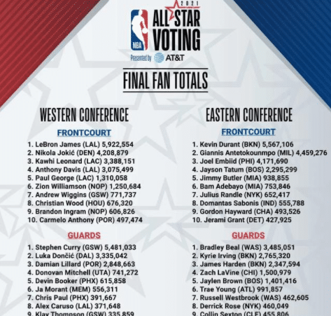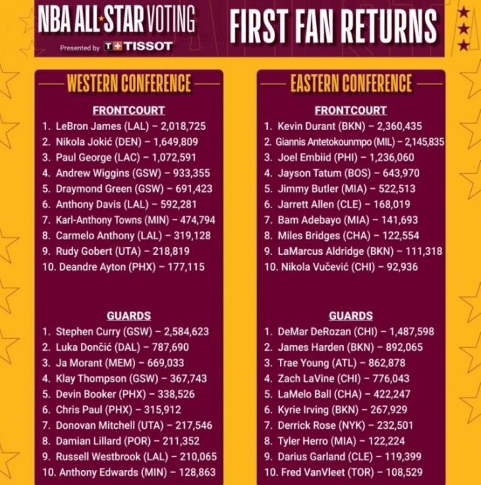 JRS直播01月07日讯 ,NBA公布了2022年全明星首轮投票结果,这其中东西部的票王被杜兰特和库里占据,杜兰特的票数是2360435票,库里是2584623票,库里也是第一期的票王。外界关注的詹姆斯位居西部前场第一名,他的票数是2018725票,在所有运动员中排名第4,仅次于字母哥、杜兰特和库里。