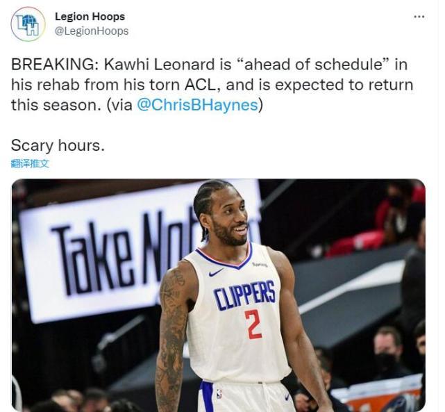 这导致莱昂纳德不但上赛季季后赛剩余比赛无法出战,按照此前的预计,小卡将缺席本赛季的所有比赛。但从现在的情况来看,他的恢复状况非常好。海恩斯在TNT的节目中,用“很有可能”这个词汇来形容莱昂纳德本赛季回归的前景。