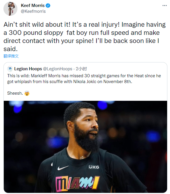 JRS直播01月07日讯 ,美媒legion Hoops晒出,自从11月8日掘金和热火冲突之后,大莫里斯因伤连续缺席30场比赛,对此,大莫里斯本人回应并且直言约基奇是一个300磅的邋遢大胖子。