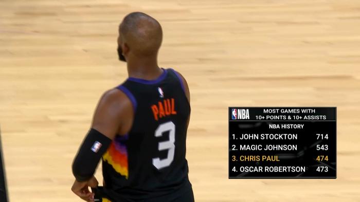 第一、保罗职业生涯474次单场至少10分10助攻,超越名宿大O罗伯特森(473次)升到历史第三位,排在前两名的是魔术师约翰逊543次和斯托克顿714次。