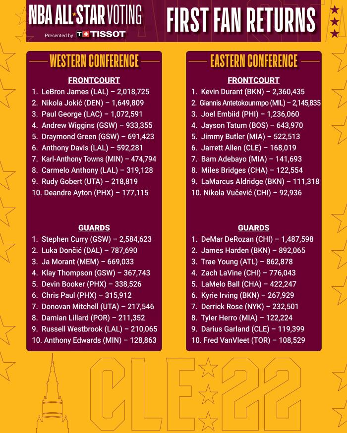 JRS直播01月07日讯 ,NBA官方正式公布2022年全明星首轮投票结果,库里2584623票力压詹姆斯和杜兰特高居联盟第一,成为首轮票王;詹姆斯暂时比库里少56万多票,排名西部第二联盟第四;杜兰特2360435票领跑东部,那么首轮票选的前十球星都有谁?