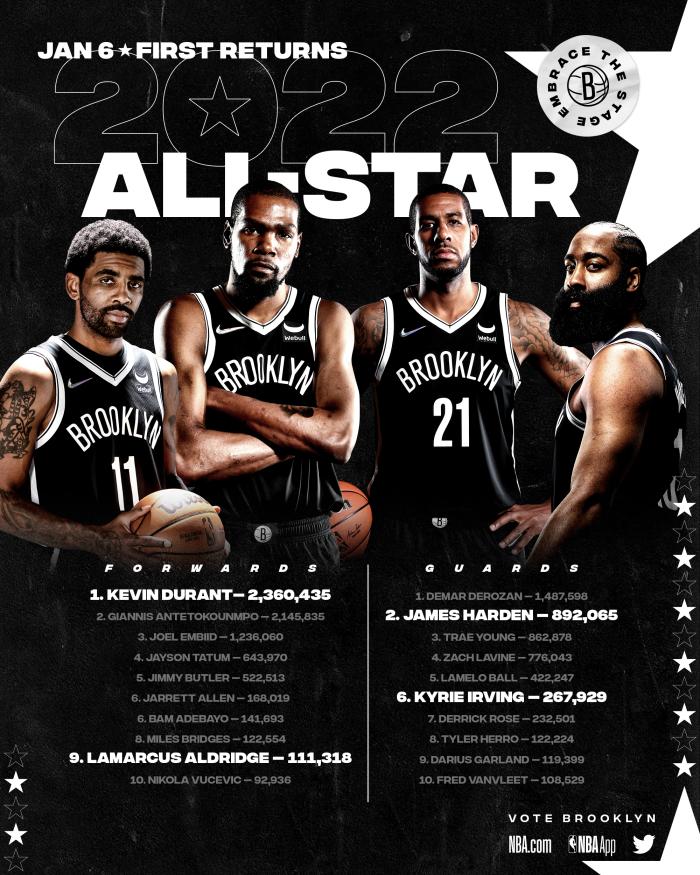 西部票王之争将是詹姆斯和库里之间的争夺,而东部票王将是杜兰特和字母哥之间的争夺,两人首轮得票相差20多万票,杜兰特暂时领跑东部;在联盟公布的首轮全明星各位置前十榜单上,篮网队四名球员上场,除了三巨头还有阿德。