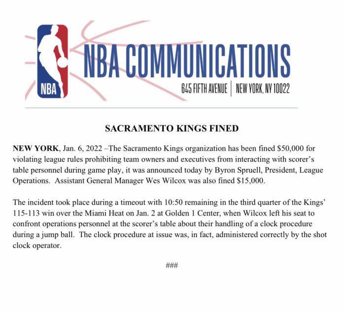 JRS直播01月07日讯 ,NBA官方正式公布一笔罚单,萨克拉门托国王队因违反NBA规则而被罚款50000美元。NBA规定禁止球队老板和高管在比赛期间与记分台工作人员互动;在国王周一对阵热火的比赛中,国王总经理助理韦斯-威尔考克斯因与技术台争执,违反了NBA规定,个人被罚款15000美元。