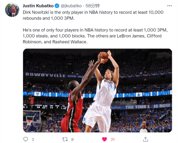 为了表示致敬,数据专家Justin Kubatko连续更推晒出了司机生涯各种传奇数据。在2001年5月14日,诺维茨基在季后赛对阵马刺的比赛中砍下42分18板6抢断,自从73-74赛季引入抢断数据以来,乔丹和司机是历史上仅有的2名能在季后赛单场送出至少40分15板5抢断的球员。