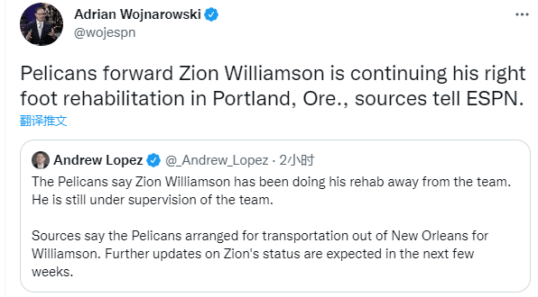 JRS直播01月06日讯 ,新奥尔良鹈鹕已经宣布,锡安-威廉森已经离开球队进行恢复治疗,球队为他安排了离开新奥尔良的交通工具,他仍在球队的监督之下;据espn名记沃纳罗斯基透露,锡安是前往波特兰接受治疗。