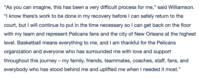 对于自己的伤病,锡安本人发表了一份声明,他表示这是一个非常困难的过程,重返赛场前仍然需要进行康复,希望能够早日为球队效力;锡安还表示篮球对我来说意味着一切,感谢所有支持我的人。