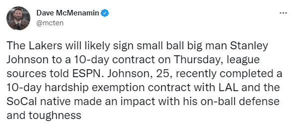 JRS直播01月06日讯 ,据名记Dave Mcmenamin报道,洛杉矶湖人会在本周五重新签下斯坦利-约翰逊,另一记者Jovan Buha也报道,湖人将用10天合同重新签下斯坦利-约翰逊,然后最终签约到赛季结束;25岁悍将即将回归,继续为湖人效力助詹姆斯冲击总冠军。