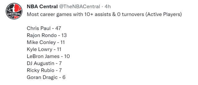 在现役球员中,保罗的这项数据的领先优势有多大?NBA Central列出的排名中,第2至5名的总和是45次,换言之,朗多+康利+洛瑞+詹姆斯,4个人生涯类似比赛的总场数是45场,加在一起还比保罗少两场。