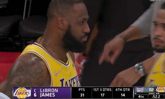 前三节湖人领先2分,但末节一上来被国王打出小高潮,直接落后了7分。詹姆斯随后率领替补阵容追分。终场前4分钟左右,两队你来我往,詹姆斯飙中两记三分,而国王也连中三分回应。蒙克也连续得分,湖人112-110领先。关键时刻,威少制造对手进攻犯规,詹姆斯二次进攻得分,湖人114-110领先4分。