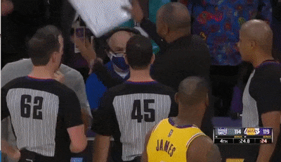 按理说蒙克两罚不中,国王应该直接获得球权,但裁判因技术故障而响哨吹停比赛,然后裁判站在一起商量,詹姆斯等球员以及两队主帅都围过来,最终裁判吹罚湖人和国王跳球,对于这样吹罚,国王主帅金特里瞬间暴怒,气得怒摔战术板,并且怒喷裁判:Damn,这是我见过的最糟糕的判罚。