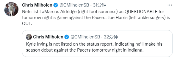 JRS直播01月05日讯 ,篮网官方公布下一场对阵步行者的伤病报告,阿尔德里奇(右膝酸痛)被列为出战成疑,乔-哈里斯因脚踝伤病继续休战,篮网巨头欧文已经不在伤病名单上,这意味着他将在明天对阵步行者的比赛中迎来赛季首秀,篮网三巨头将赛季首次合体。