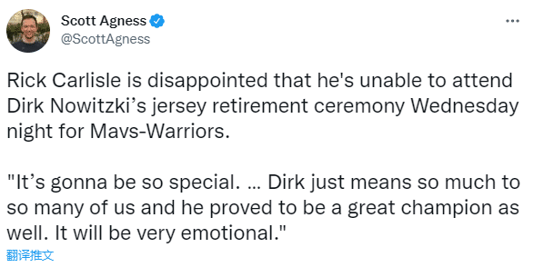 对于这件事,卡莱尔本人表示:我明天无法参加诺维茨基的球衣退役仪式,我感到很失望。德克对我们很多人来说意义重大,那将会非常特别,他证明了自己是一位伟大的冠军球员,这将是非常激动人心的。