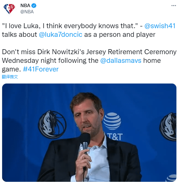 JRS直播01月05日讯 达拉斯独行侠将在明天与勇士赛后,正式为“诺天王”诺维斯基举办41号球衣退役仪式;不久前,诺维斯基正装出席球衣退役仪式的新闻发布会,NBA官方连续更新多个诺天王的采访视频,并且提醒大家不要错过诺天王的球衣退役仪式。